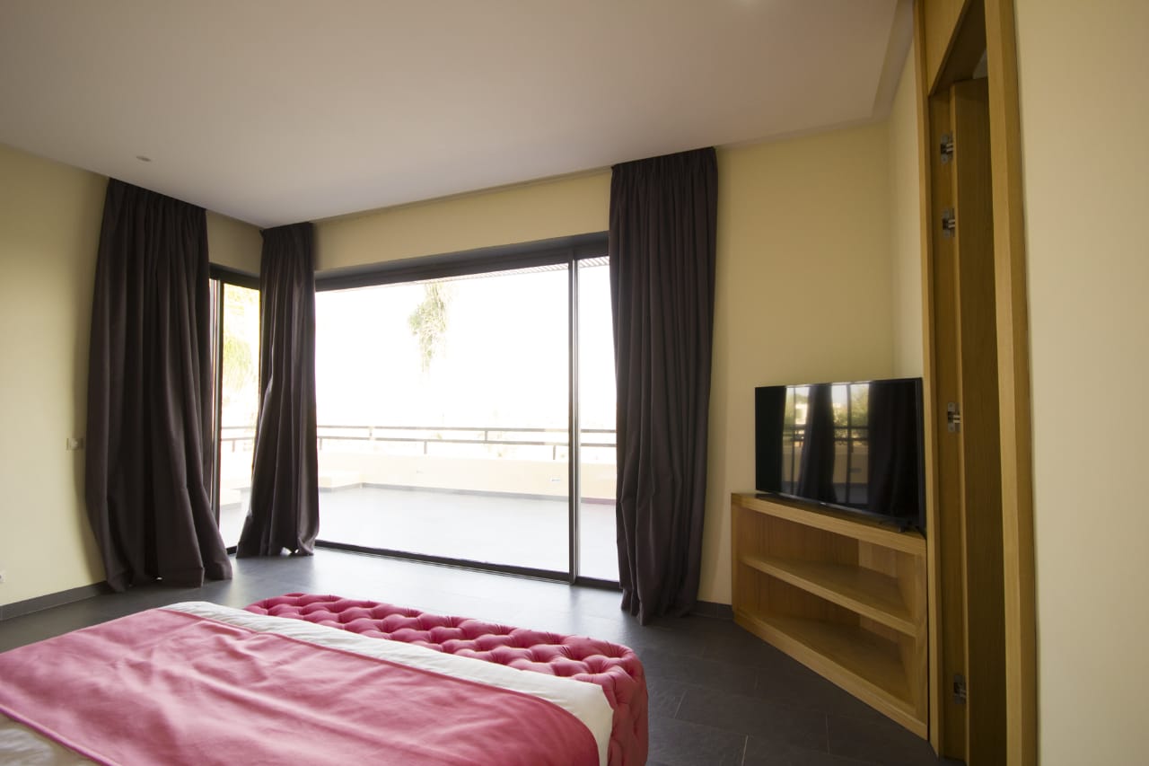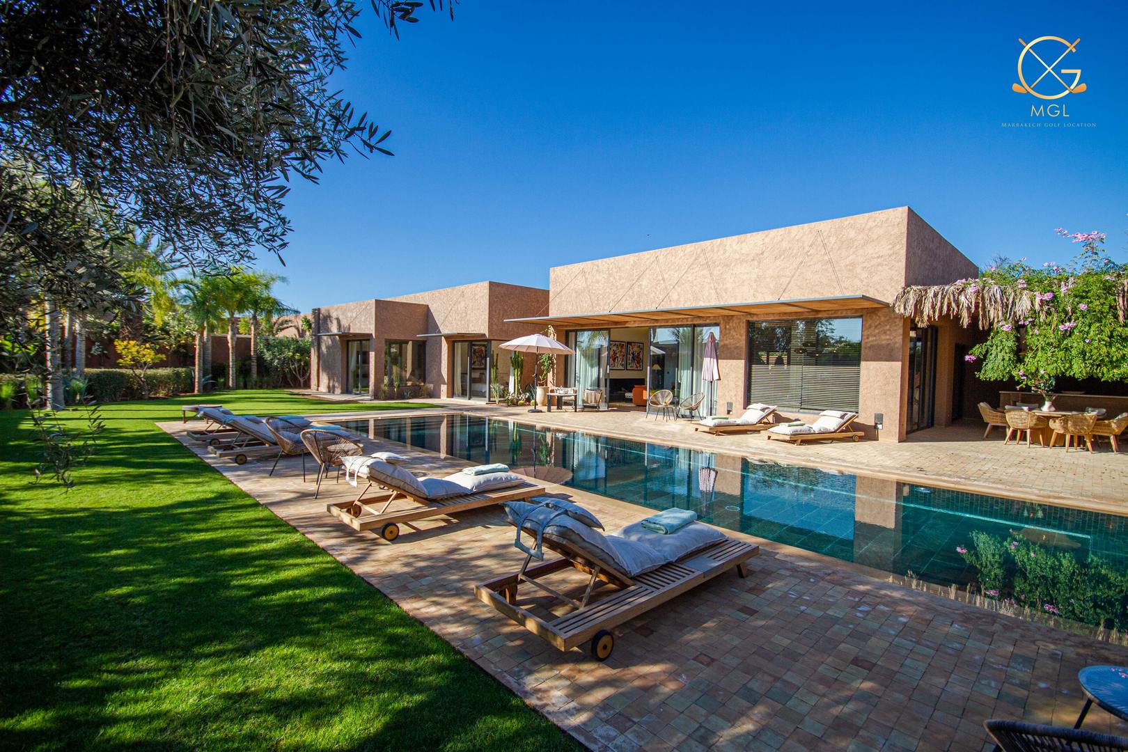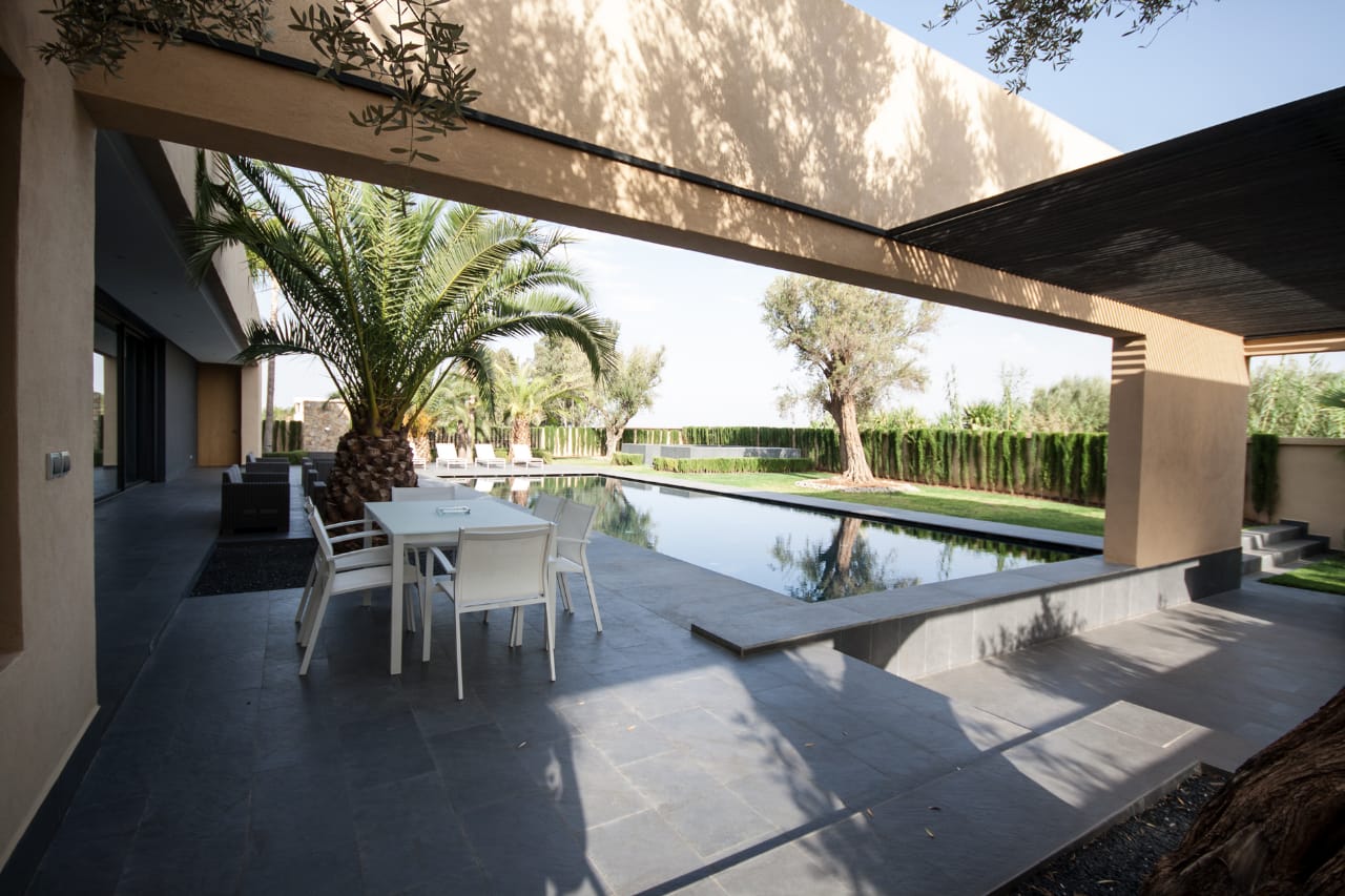 The villa Mamounia is one of the most beautiful villa of the Amelkis area, it consists of a double living room, dining room with large openings on the terrace garden and pool, a kitchen, an outdoor lounge and a first suite with bathroom, toilet and dressing room.