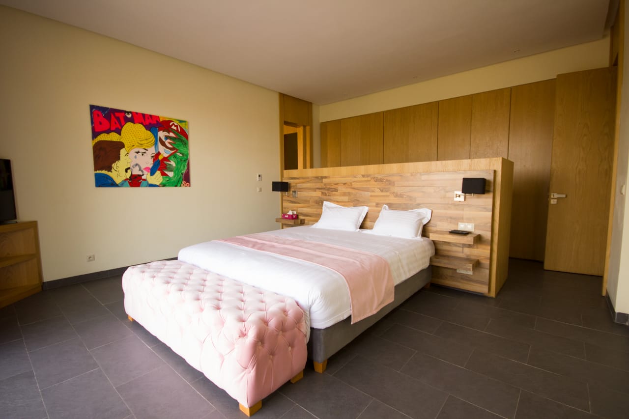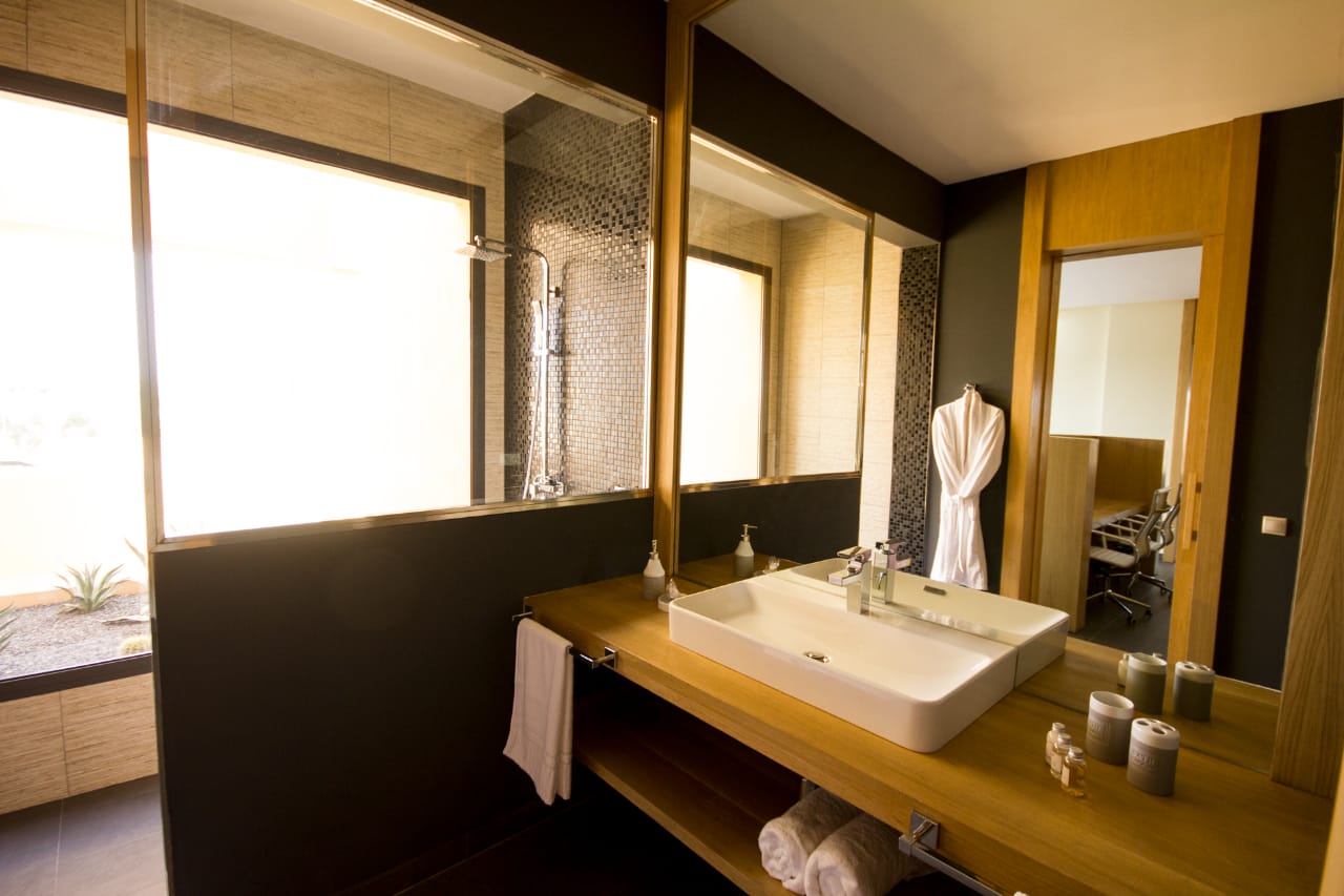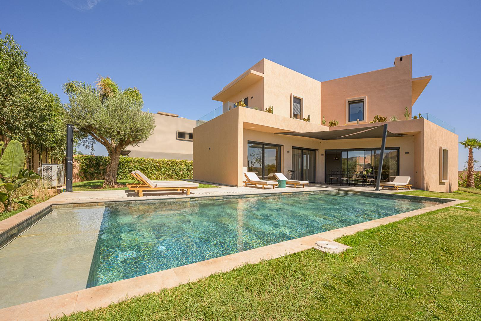 The villa Mamounia is one of the most beautiful villa of the Amelkis area, it consists of a double living room, dining room with large openings on the terrace garden and pool, a kitchen, an outdoor lounge and a first suite with bathroom, toilet and dressing room.