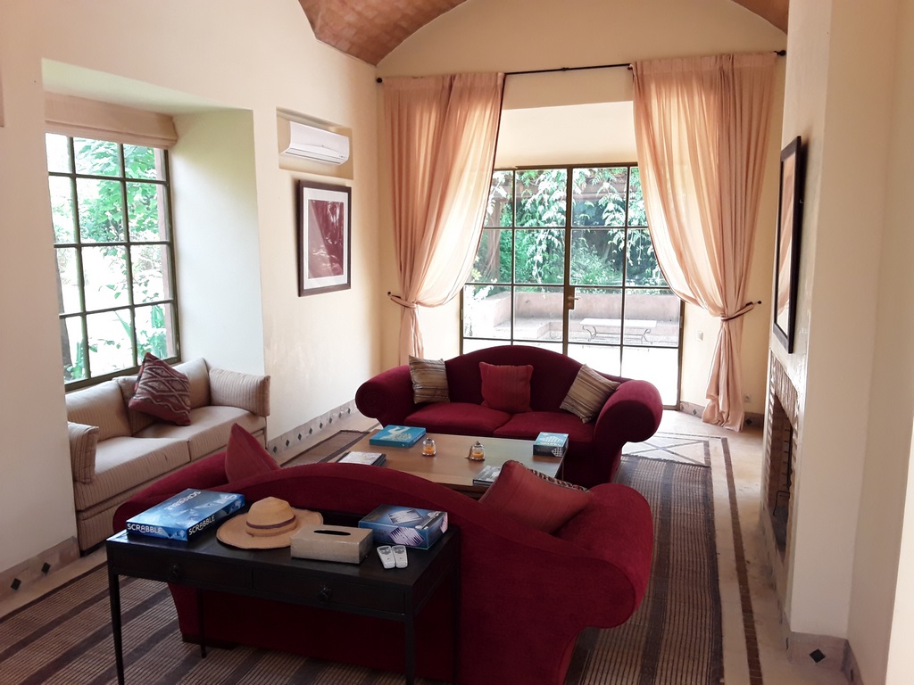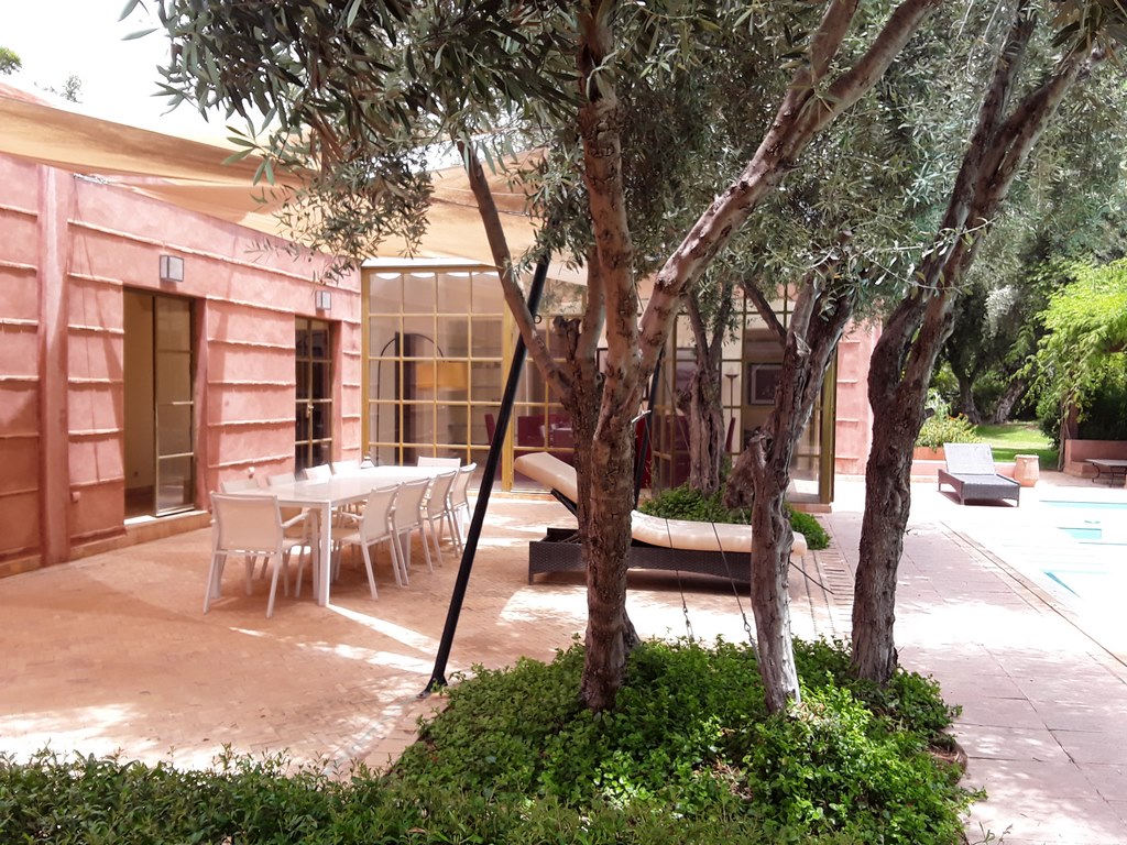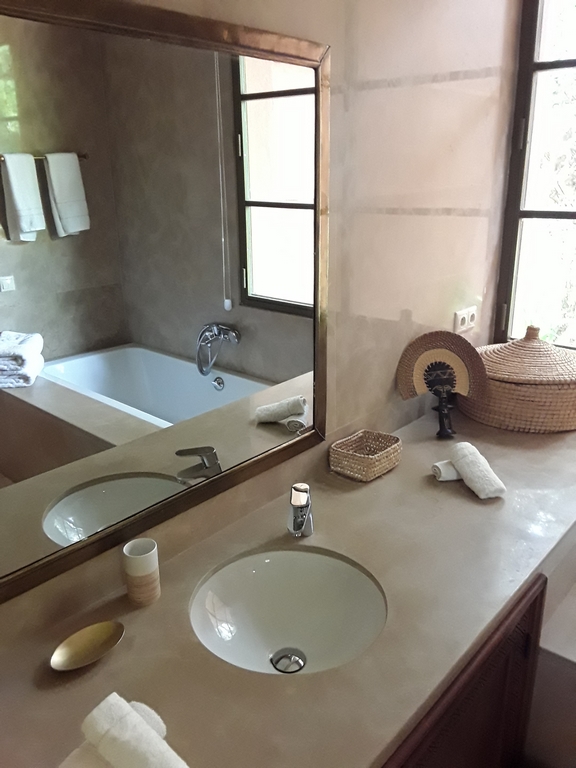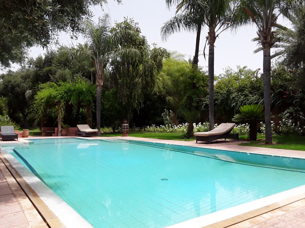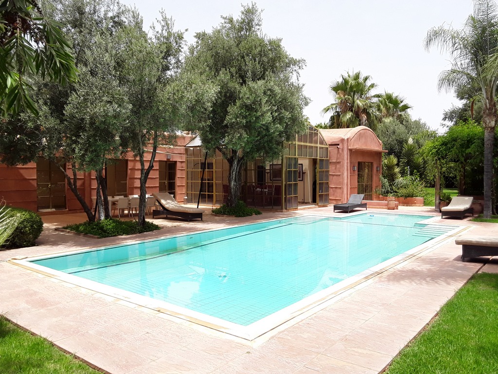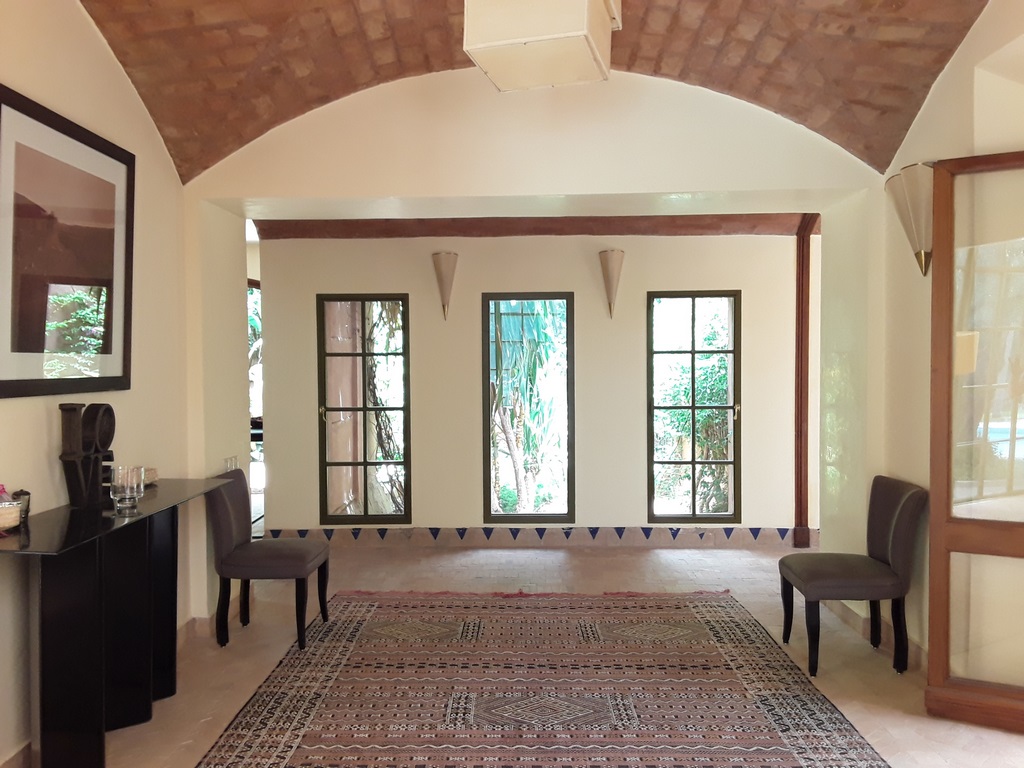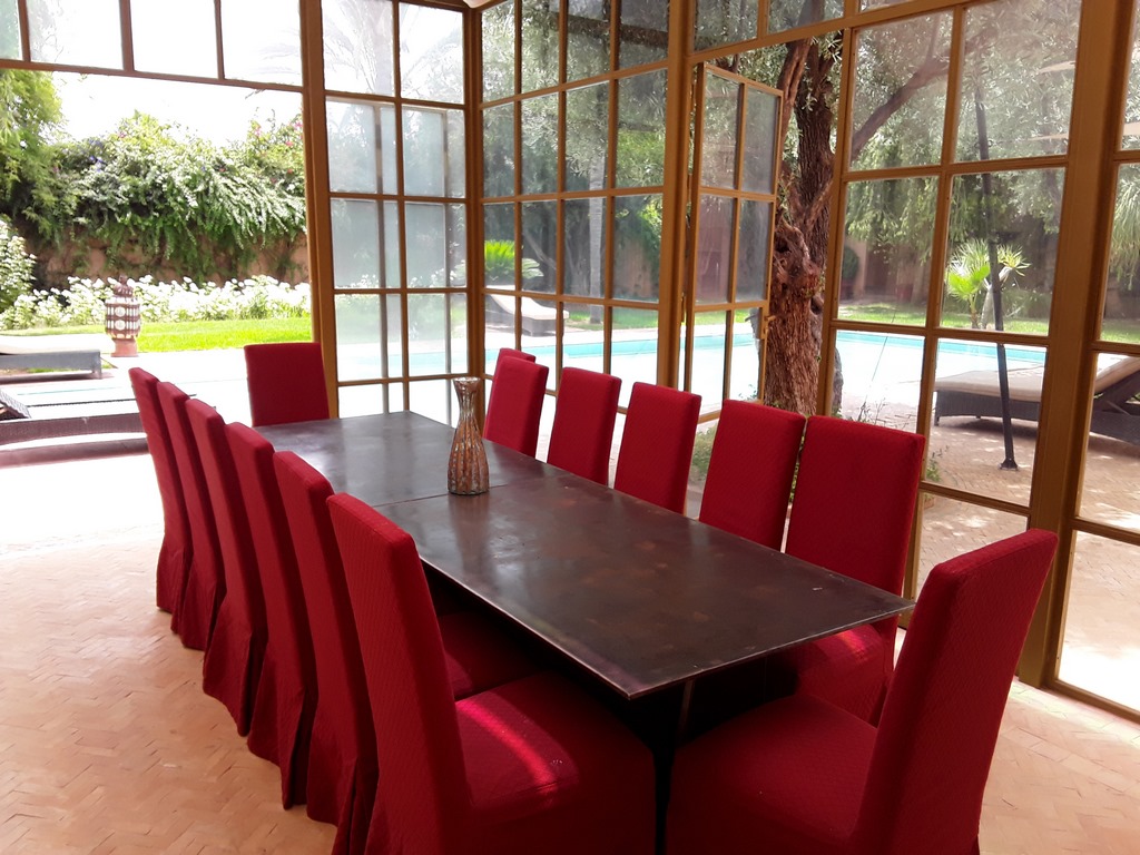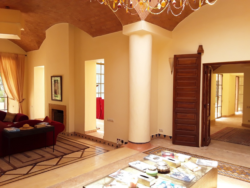 The villa of 600m² consists of an entrance that serves a Moroccan living room, a living room onto the fireplace opening onto the garden, a fully equipped kitchen, a dining, a di,ning room under glass roof overlooking the terrace and private heated pool and a outdoor lounge where you can enjoy your meals enjoying the mild climate in Marrakech…